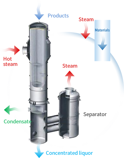 • A falling film evaporator is a vertical tubular heat exchanger. Under gravity, the fluid flows along and down the inner wall of the tube in a thin film to achieve evaporation and heat transfer.